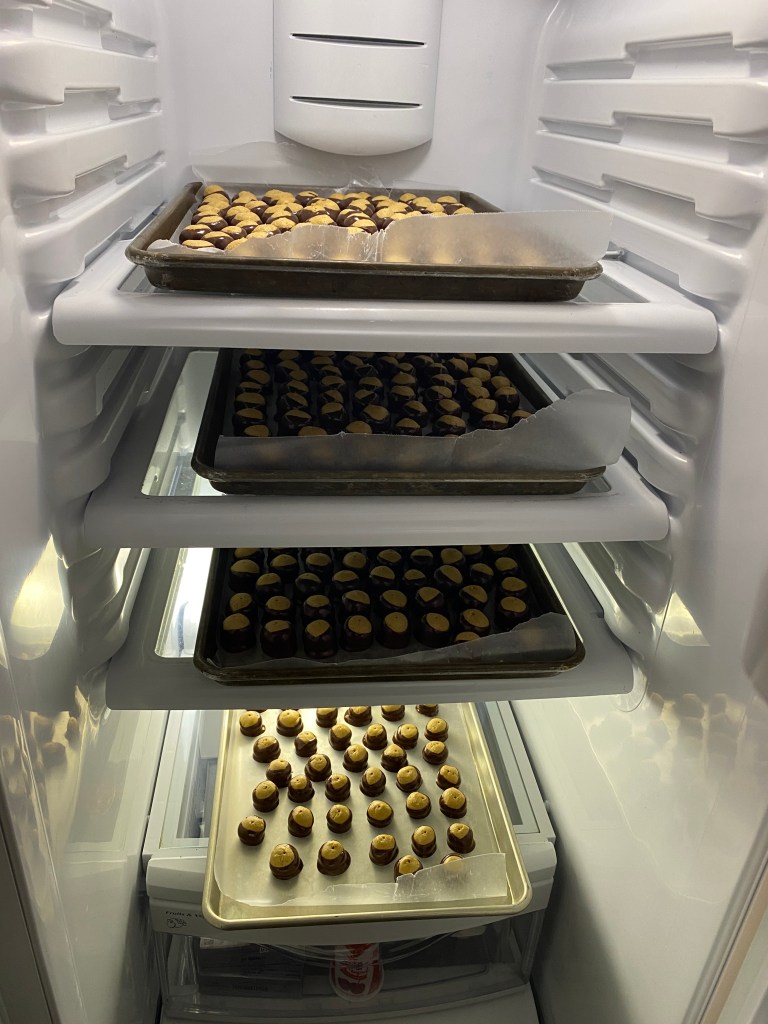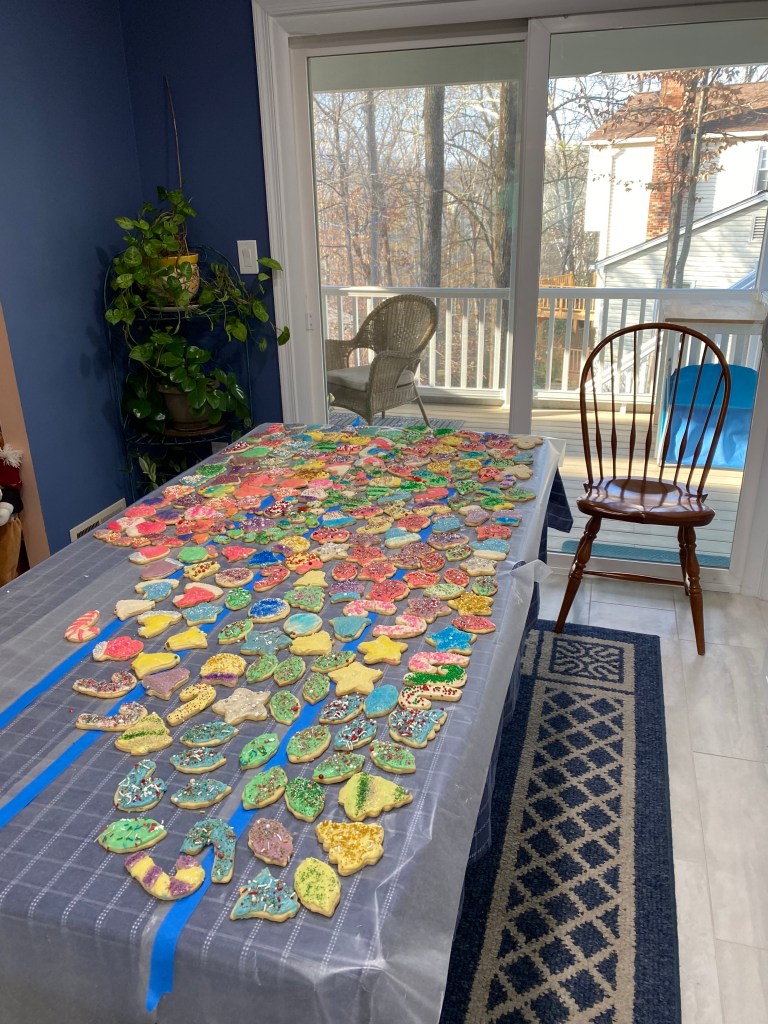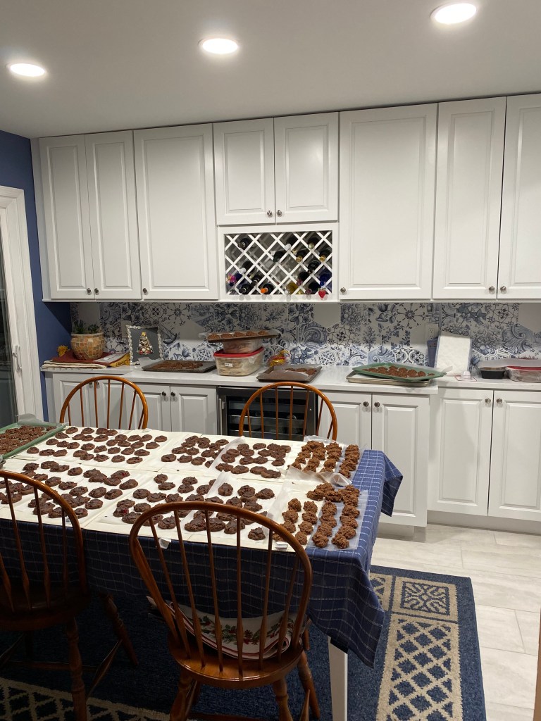 The Missus started the Christmas cookie baking a little earlier and moved the sugar cookies towards the top of the list. It’s a significant effort overing three days: making the dough; rolling, cutting, and baking, and; frosting. Girl-child was under the weather for the day 2 and didn’t make it for day 3 but was admirably subbed by hubby. Continuing the recent trend, a few new types were added to the standard menu of sugar (GF too) cookies, buckeyes, chocolate yogurt melts, date pinwheels, no-bakes, peanut butter, and molasses. Augmenting this year’s list were red velvet cream cheese, Oreo’s and M&Ms and a rice-crispies style cookie. Pictures of new only? As the recurring line-up looks the same as previous year’s. Wasn’t a record crop but the Missus still baked over 1800 cookies!