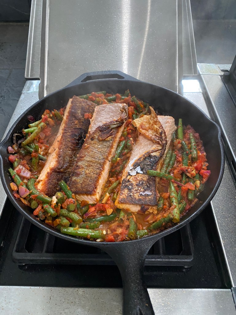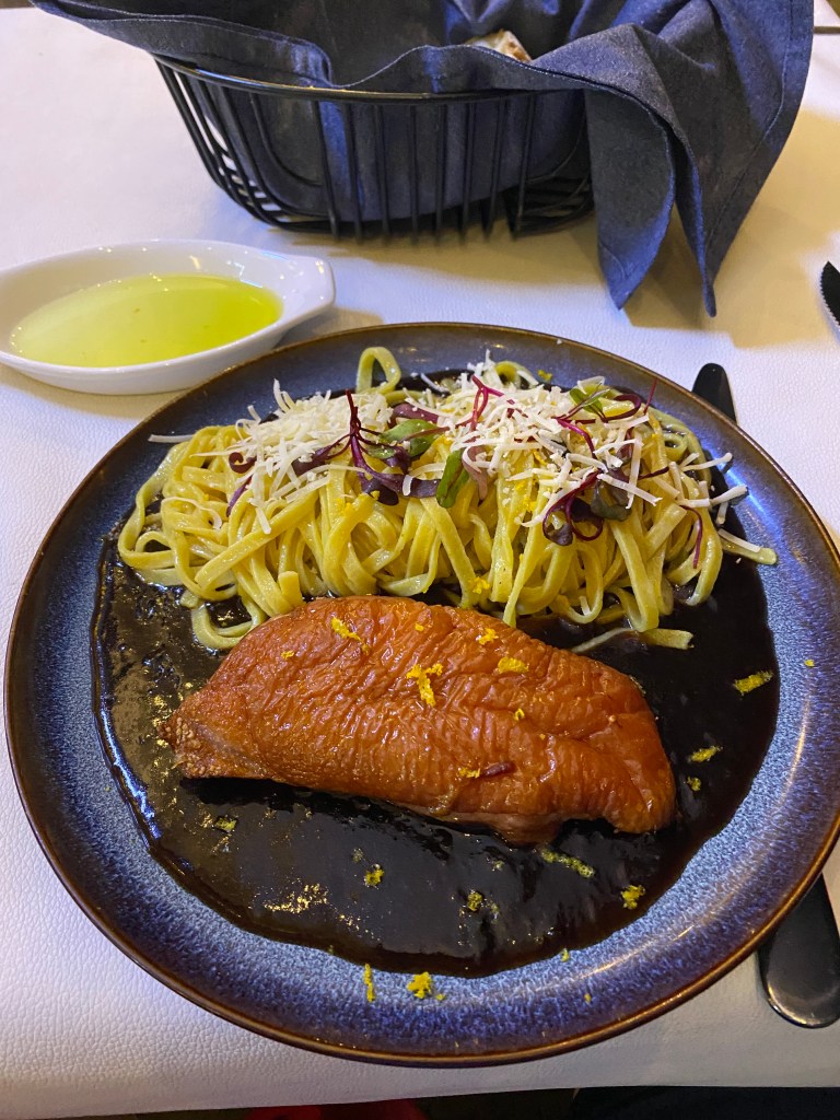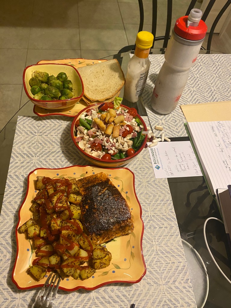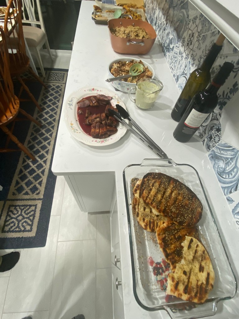 Made some new meals (and repeats), bread, and desserts and had a nice meal in Orlando after the 300K. Also, boy child was in charge of Thanksgiving and prepared an awesome Indian-themed meal with duck breast as the lead. The Missus (with assist from girl child) did their usual holiday cookie bonanza – cookie penance required. Have made several different recipes involving salmon but prefer pan-seared and/or grilled over all the others. Simple is better in this case. New meals included eggplant parmigiana, spinach artichoke chicken bake, tuna cacio e pepe, salmon and green beans in red pepper sauce, beef bourguignon, and homemade salmon burgers (the only use for frozen sockeye salmon from Walmart). New desserts included kitchen sink skillet cookie, pumpkin maple muffins, apple crumble cake, and crispy tiger bars. Repeat items included salmon, roasted potatoes and Brussel sprouts, rotisserie duck, carrot cake muffins, and bread. Really love the 3 lb loaf! A well-deserved meal at Turci Pasta after 10+ hours of moving time included salad, smoked duck breast with fettuccine and peanut butter cheesecake.