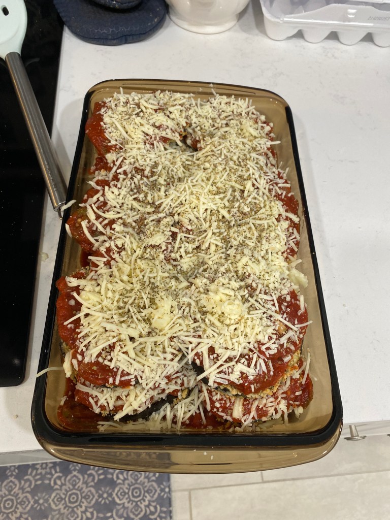 Made a couple of new meals and put the fresh fruit to good use (muffins and a crisp). Half of the walnuts are drying – still have the other half to husk. Not an easy or clean task. Good thing the harvest article mentioned gloves, otherwise the entire hand would’ve been stained a dark brown. Even with gloves, the thumb still ended up discolored. First time making a dump cake (cherry) with layers of crescent rolls, cream cheese and sugar, brown sugar, cherry filling, yellow cake mix and topped with cinnamon. Made apple cinnamon (forgot to include the raisins), pear and walnut muffins, and apple-pear crisp with the fresh fruit brought back from OH. New dinners included a Greek classic, Moussaka and Patates Lemonates and a Louisiana version of shepherd’s pie, Shreveport Pie made with turkey and bayou-style spices. Any meal topped with mashed potatoes is a winner according to the Missus. The Moussaka was very good but kind of destroyed the kitchen and the Missus was none to pleased. The recipe used consisted of three layers: fried eggplant and yellow potatoes, meat sauce. (lamb), and topped with a bechamel sauce. Apparently there’s somewhat of a debate amongst Greek chefs regarding the inclusion of potatoes. Frying the eggplant and potatoes splattered hot oil everywhere. Still have flash burns on the back of my hand as a memento. Everything cleaned up just fine and the meal was quite good.