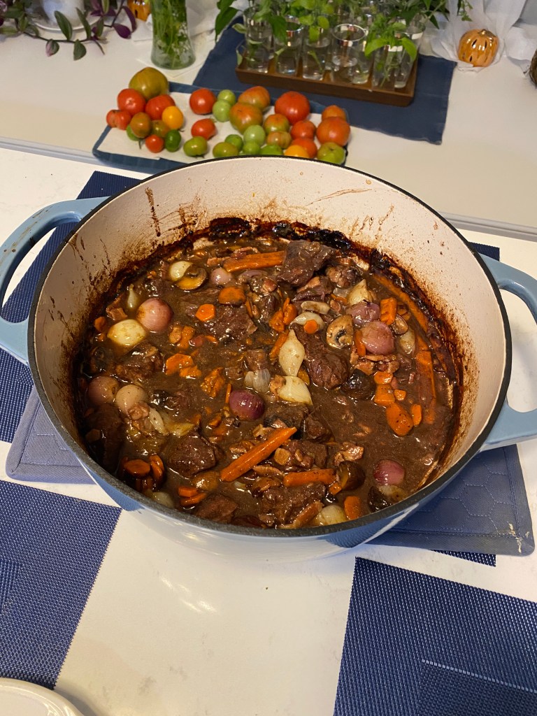 New in the culinary ledger were stuffed peppers, rotisserie duck, BBQ chicken twice baked potatoes, one pot chicken shawarma, and a Fridge Queen Cake (forget to snap a photo). Boy child made a short, return visit and treated us to stuffed pork loin (spinach, onion, and Brie cheese), eggplant, zucchini, and tomato ratatouille, and turnips in remolaude sauce with chives, bourbon, and cream. The missus made a crème brulee cheesecake. Ironically, despised stuffed peppers as a child. No issues with consuming the stuffed portion but the peppers were gag worthy. Tastes definitely change with time and very much enjoy peppers, including stuffed peppers especially when the meat is ground lamb. Fair bit of searching required to obtain a whole duck. If planned ahead, nearly every local butcher could have ordered one but it made the menu Thursday night for the following Sunday night’s dinner. Good thing it was only 5 pounds as anything bigger wouldn’t have worked on the grill. Rotisserie adapter wasn’t the problem but even with removing the center grill grates, a larger bird wouldn’t have fit over the drip pan. Dry brined the duck 24 hours earlier, stuffed it with herbs, spices, scallions, and an orange and prepared an orange marmalade for basting. Cooking time wasn’t quite as long as anticipated, but it had a really good flavor. Wasn’t gamey at all. Accompanied the duck with twice baked sweet potatoes and roasted broccoli. The Missus wasn’t too keen on the shredded chicken and BBQ sauce but all of the flavors and textures blended well together. The chicken Shawarma was excellent. The chicken had a great flavor and using the same cast iron skillet to prepare the orzo infused it with additional flavoring. Initially the idea of placing the cold cucumber, tomato, and Feta salad on top seemed unnatural but again, the flavors blended well together. The Fridge Queen Cake (no photographic evidence) really wasn’t a cake. It consisted of heavy whipping cream (whipped by a mixer) with softened cream cheese, fresh blackberries, and blackberry jam in between layers of graham crackers topped with whipped cream and garnished with more fresh blackberries. Placed in the freezer overnight to set, taken out a few hours before serving then stored in the fridge afterwards. It was pretty good, especially when served with a scoop (or two) of southern blackberry cobbler ice cream. The boy child’s dish was extraordinary, as usual. Had to make a trip to the local butcher’s shop as the local grocery stores only had mini pork loins. Learned a couple of things about eggplant. Tasked to obtain Japanese eggplant, zucchini, and roma tomatoes all of similar diameter. Another search and find mission and eventually found Chinese eggplant which were an acceptable substitution. While on the hunt for duck, came across Japanese eggplant. The Chinese version are purple in color and much longer but consistent diameter than traditional eggplant while Japanese eggplant resemble a very dark purple or black zucchini. Who knew?! The Missus made two practice crème brulee cheesecakes on consecutive Sunday family dinners (no one complained) in preparation for real one with the boy child. The first one didn’t have the burned sugar topping as the kitchen torch didn’t arrive in time (to be honest, it wasn’t ordered in time). Nearly a year had passed since family dinner included both children. There wasn’t any difference between the second and third iteration – they were both excellent (as was the first one, too).