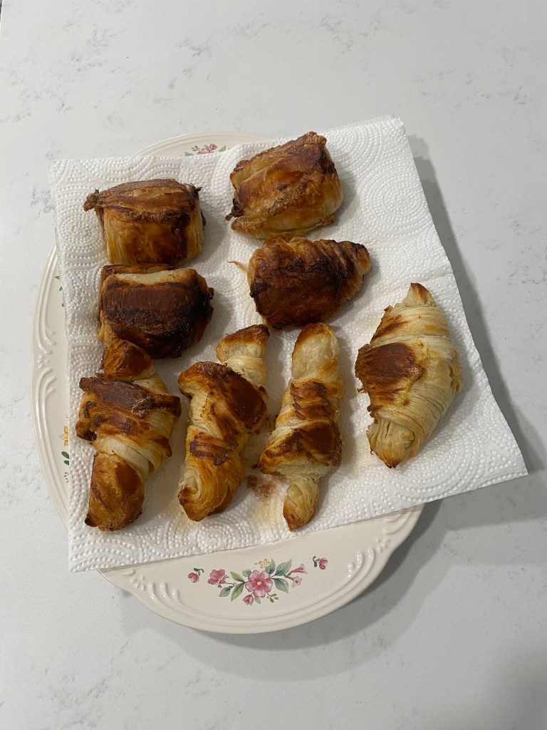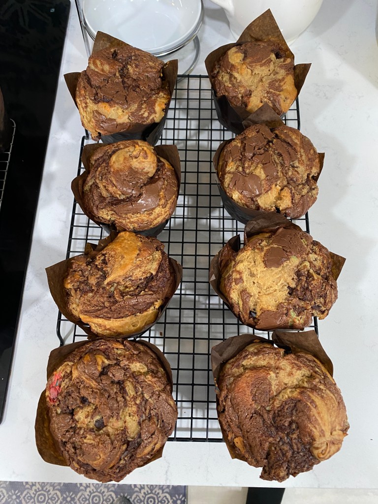Received a bread and pastry cookbook for Christmas from the girl-child who very emphatically stated she expected some pain au chocolat in the not too distant future. Little known fact: making the laminated dough is a three-day process. At least for home bakers; perhaps commercial bakeries have more economical and streamlined approaches. Laminating is essentially wrapping a dough around a block of butter, 2 sticks for my efforts, and with a series of rolling, folds, and proofing before finally shaping and baking. Technique, shape, and taste did improve across the initial three dough balls. Croissants and pain au chocolat tasted much better on the final attempt although still no competition for Parisian products. Discovered a new muffin flavor: peanut butter-Nutella swirl although the swirl was limited to the top of the muffin as the peanut butter batter was too thick to accommodate a deeper swirl. improved an older muffin recipe by increasing the amount of liquor: bourbon, maple, and pecan.
