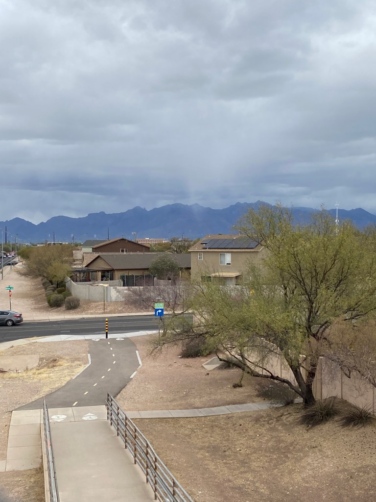 After a quick round robin of introductions and bike checks in the parking lot, the purpose of the trip was underway. The planned route was 41 miles and slightly less than 2,000 feet of elevation. Added an early loop then caught up with the group just prior to joining Tucson’s extensive network of paved, multi-use paths. Unlike most paths, there were minimal street intersections as the paths normally went under crossing roads. Tucson has over 130 miles of dedicated paths and many roads have bike lanes. Quite the bike-friendly city. The paths see heavy use from across the cycling spectrum with lots of large groups, single file, and older cyclists. Awesome to ride outdoors with minimal snivel gear (base layer and arm skins).