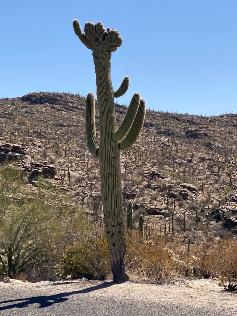 Day 2 started with breakfast at a common cyclist hang-out and starting point: Le Buzz Café. After a chorizo breakfast burrito and almond croissant (that looked more like a bagel but tasted more like a croissant), off to Saguaro East National Park. The first five + miles was into a steady headwind a prelude to the next day’s ride up Mount Lemmon. Fortunately, the route made a right turn just before mile marker 0. Able to use my National Parks pass to offset some of the park entrance fees charged to BA – no charge for pass holder and 4 others. Managed two loops around the 8-mile, one direction loop before stopping for lunch and the arrival of our tour’s final member, Flutist. She began her day on the east coast with a pre-sunrise flight, a 30-minute hustle to make the connecting flight, and Uber ride to the Park. That’s a dedicated cyclist. Well done! Learned that saguaro cactus don’t start growing their distinctive ‘arms’ until reaching 50-70 years old. They are also susceptible to a rare genetic mutation (one in 2000) that features a fan-shaped growth pattern at the tip of it’s shoot. Those afflicted are called crested cactus. There were 3 visible along the route – passed one three times (part of a repeated stretch for additional miles) but still didn’t see it. Wondered why some from our group were on the other side of the road before passing them going in opposite directions. Another was along the route to lunch and would’ve passed that one twice without noticing. Used to consider myself observant. Blame it on the detached retina and subsequent corneal complications. Much more focused on the road in front instead of the scenery. Speaking of which, AZ has it’s share of unique and spectacular sights. In fact, decided to winter in AZ once we sell our southern training camp location in FL. Love the house and enjoy spending winters there, but the Missus isn’t keen on wintering there once she retires and it’s not the best financial decision of paying for 12 months but only enjoying it for 3-4 months. Instead, use some of those funds for an extended AirBnB place with the ability to discover new warm winter locations. Think Yuma will be the first test location. More isolated but also warmer than Phoenix and Tucson in the winter. Started the return trip with the third and final loop before leaving the park and heading back on roads, different sections of the bike paths, and the climb up to our hotel, Loews Ventana Canyon Resort (quite posh accommodations). Ate a solo dinner at the resort. The cornbread and broccolini were good but the duck was overcooked. Disappointing.