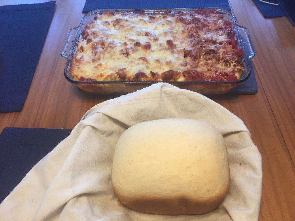A long ride always makes dinner taste better. Tonight’s meal was baked rigatoni and sausage. We always make our own pasta sauce using canned diced tomatoes, tomato paste, a little sugar (brown and white), and spices. Freshly sautéed mushrooms, garlic, and onions usually accompany the sauce. The Missus prefers less cheese on hers which explains the difference in the picture below. We also had fresh, homemade bread. Yes, we use a bread machine but not pre-packaged bread mixes. Tonight was onion and cheese bread.
