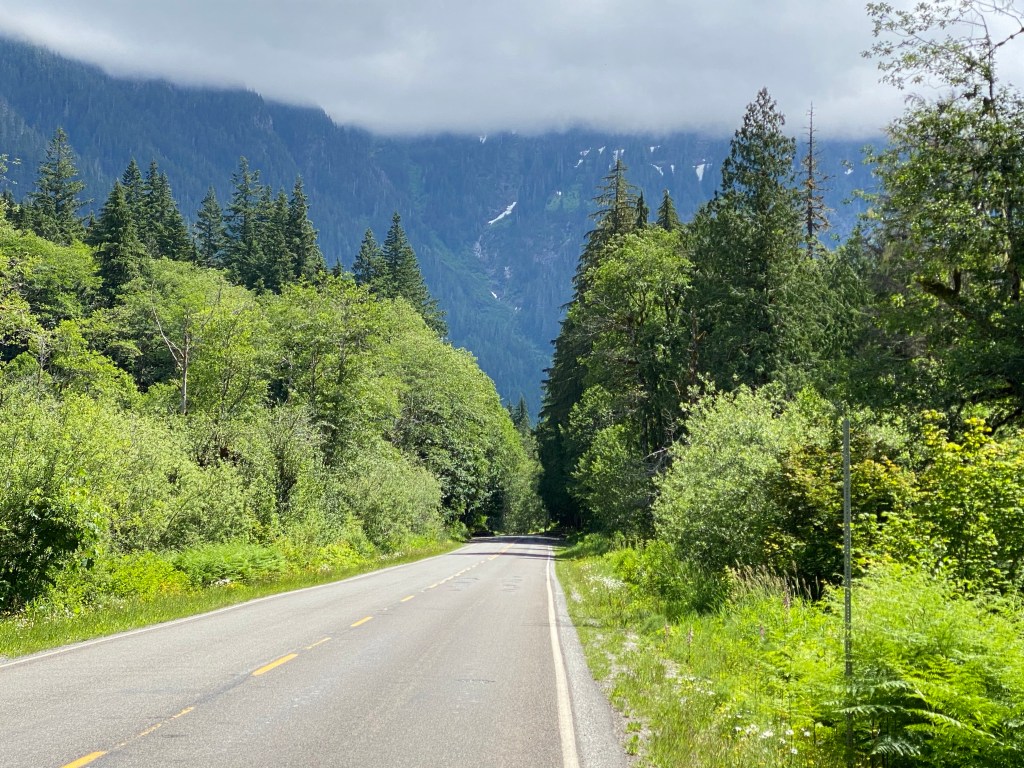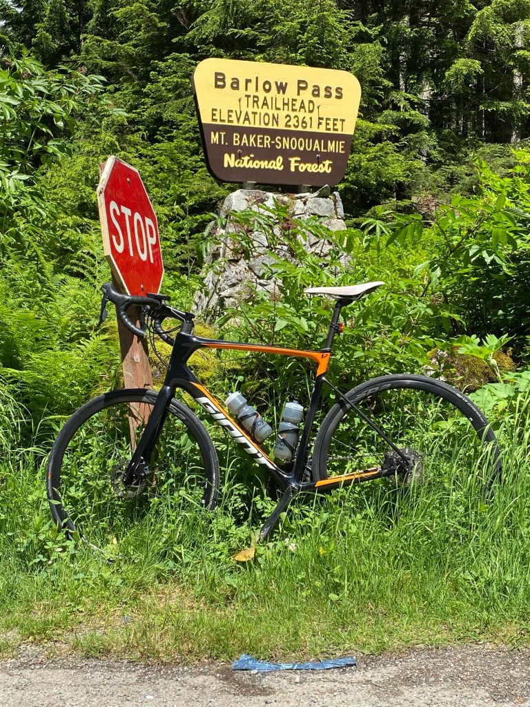 The final tour rider (bringing the total to 4 plus 2 guides) is a local and rode to the bakery. While the guides prepped our bikes – pedals and saddles – we visited the bakery. Can’t go wrong when you start the day with a scone! Afterwards it was time for the overview of the day’s itinerary. Then it was time to get the show on the road. The first 6 miles was along the Centennial Trail. Not a big fan of trails on a road bike but it wasn’t nearly as congested as the W&OD back home. Did see some natural wildlife – a bald eagle and a small pond with about a dozen ducks huddled together in a couple of groups. We finally left the trail for the roads and made our way to Mt Baker – Snoqualmie National Forest. The Pacific Northwest Scenery is a must see for anyone who hasn’t and requires a return visit for those who have. The climbing on the day’s route wasn’t inconsequential but most of it was manageable in the big chainring without really spiking the power output. Having a GoPro would’ve been much more convenient than removing my iPhone from it’s double-layered ziplock baggie moisture protection solution. But then, I would’ve stopped more often and taken more pictures. Is that a bad thing? Regardless, there were lots of opportunities to take pictures of the heavily forested or barren mountains and the dozens of rivers and creeks that were either crossed or paralleled. After the guide prepared lunch at Barlow Pass, and most of the climbing behind us, it was time to remount the bike and continue on to our destination. The first 14 miles after lunch was mostly a descent on a gravel road through a fair bit of old growth forest. Now I’m very much a novice when it comes to gravel but disc brakes are a definite plus. Having 28mm tires doesn’t hurt either. I’ll be honest, there was a fair bit of breaking going on. The gravel was pretty packed but potholes were a concern in several sections and the dappled sunlight didn’t help visibility. Only me and one other rider (the only female in the group) braved the gravel section – the others rode in the van. At some time after the gravel section the Giant bike developed a noisy crank along with a front derailleur rub anytime the chain was beyond the the midpoint cog of the cassette. Rub worsened as cross-chaining increased. Maybe I’m just hard on cranks because my Evo often makes the same annoying noise. Nearing the end of a long day, around the 95-mile mark, a black bear ran across the road. Again, a GoPro would’ve come in handy but alas, I have no iPhone confirmation of the bear sighting.