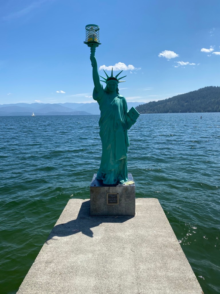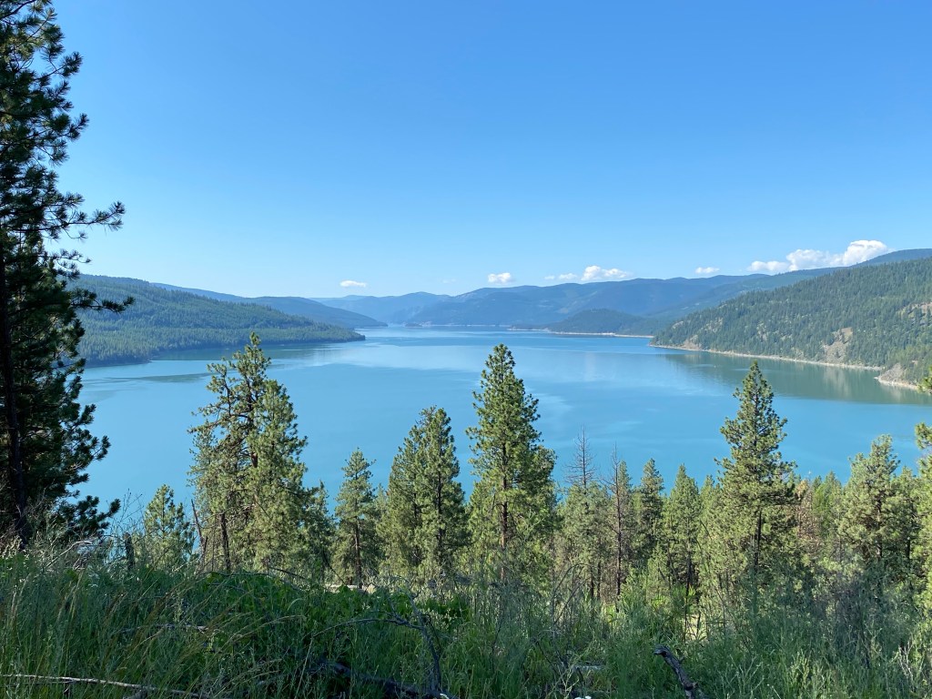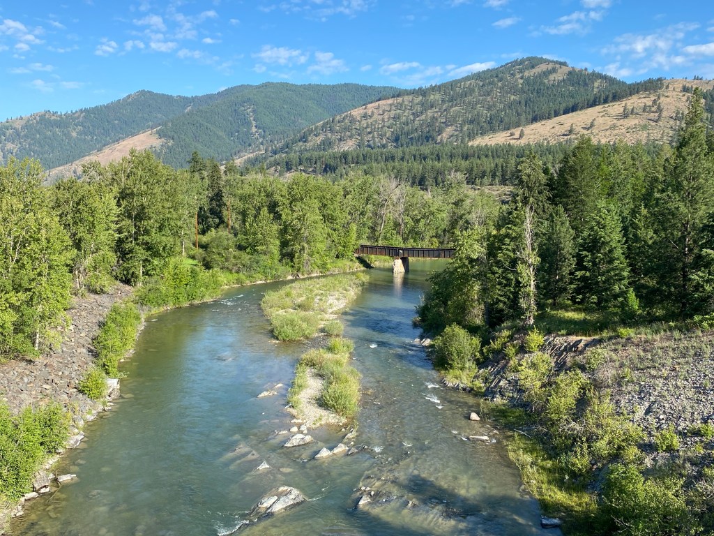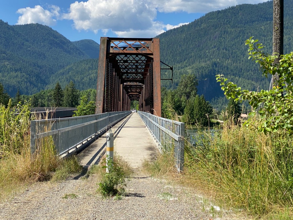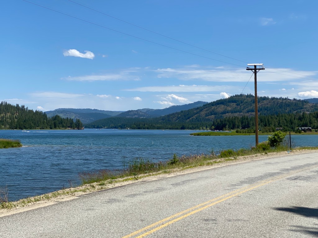 The 4th of July fireworks and festivities enabled a later start – 0800 for breakfast at the van which included muffins, Greek yogurt, croissant and juice. Today’s ride was just short of a century with considerably less climbing than previous days. It would be a good barometer of muscle recovery after the short ride yesterday and climbing to follow in the next two days. Goal today was 2.5 w/kg average on the flats and hold tempo pace, 3.5 w/kg, on the few sustained climbs. The route would primarily follow a series of waterways leaving Idaho and entering Montana. The first 1.5 miles headed north on the Sandpoint Byway Bike Trail until it ends at ID-200. The next nearly 15 miles skirted Lake Pend Oreille (pronounced pond oh-RAY and means “hangs from the ears” or “earloops” in French) and its various tributaries and watersheds in a clockwise direction: Pack River, Ellisport Bay and Denton Slough. The road is sandwiched between the lake on the right and the Kaniksu National Forest on the left and runs generally flat with numerous cutouts to enable photo opportunities.