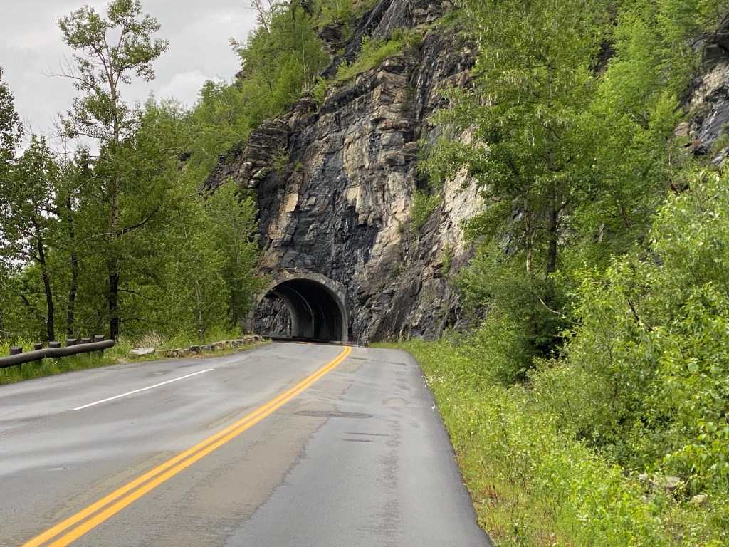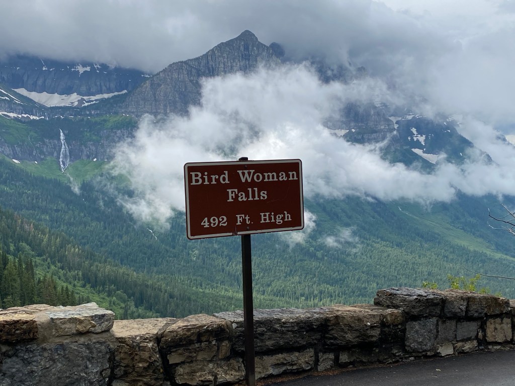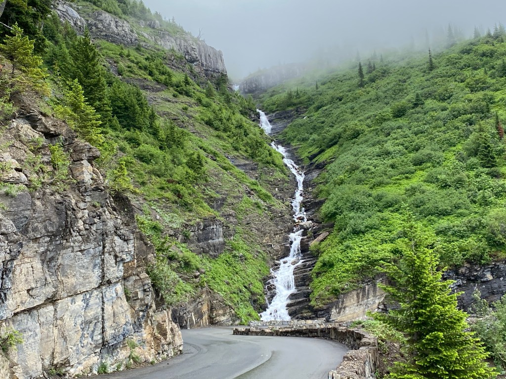 It’s 30 miles from Apgar Village, elevation 3169 ft, to Logan Pass, elevation 6646 ft, with the last 10 miles being the climb. The road runs between the Livingston Range on the left and Lewis Range on the right; both of the Rockies. The first 20 miles only has 700 ft of elevation change. Legs are better than yesterday but not as good as two days ago. There’s minimal vehicular traffic at 8 am and the trip to Avalanche Trail goes quickly although there are a few stops for pictures. It could easily take an entire day driving to the summit as there are so many spectacular views and photo opportunities. The guide arrives first at Avalanche and learns a ride to the summit isn’t going to happen today. The road is closed to all traffic a short ways beyond “the loop.” Very disappointing that won’t be able to cross completing Going-to-the-Sun Road off the Bucket List. Logan Pass was just recently cleared of all snow but road repair is still ongoing. Well, at least the rain stopped. The ascent starts right at the 20-mile mark and much of the gradient falls between 3.5 – 5.5% although there are brief pitches that hit nearly 8%. The road is closed at Bird Woman Falls – about 4.5 miles and 1300 feet short of Logan Pass. The climb isn’t hard and the scenery demands a casual pace. This ride isn’t about power goals or anything else. Just enjoy the moment. Everyone on the tour made it to the Falls.