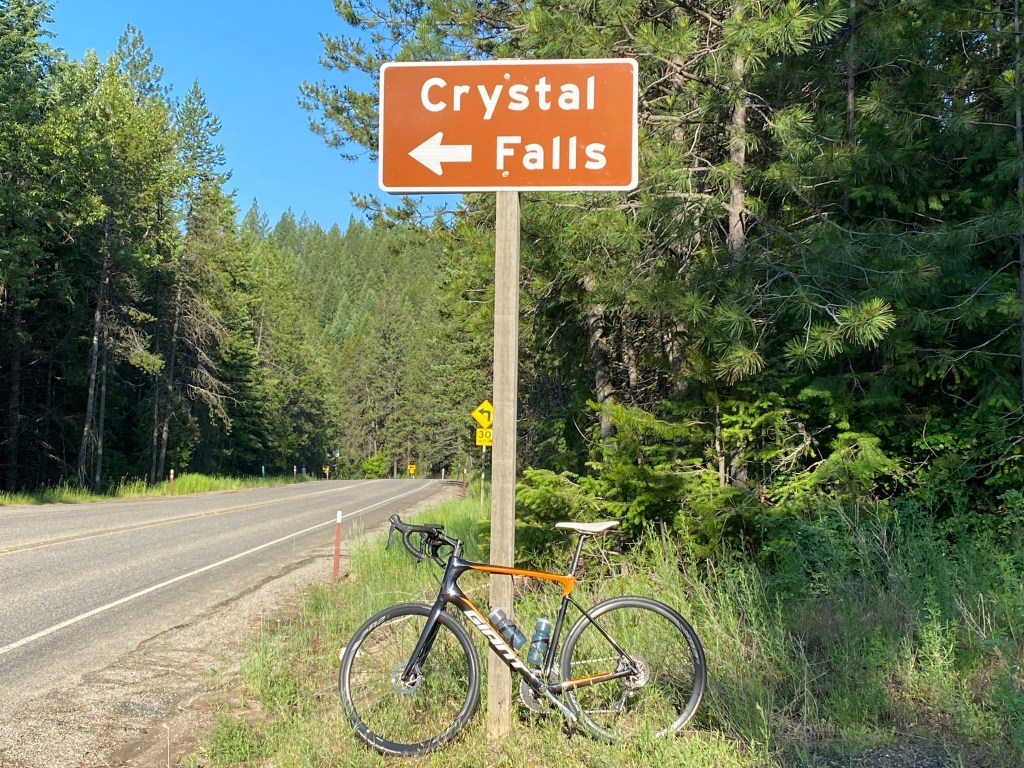 The climbing starts about one mile removed from the hotel parking lot and would cover over 3200 feet within the first 32.5 miles. Based upon the route profile, this initial portion of the route is referred to “the shark’s fin.” For those of a geometric persuasion, it’s nearly a quarter of a circle or quadrant. Most of the gradient was below 5% but after yesterday’s ride, it was still over two hours of pedaling mostly uphill. Did stop once to take a photo of Crystal Falls.