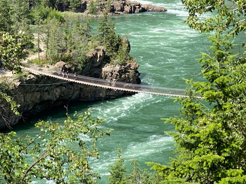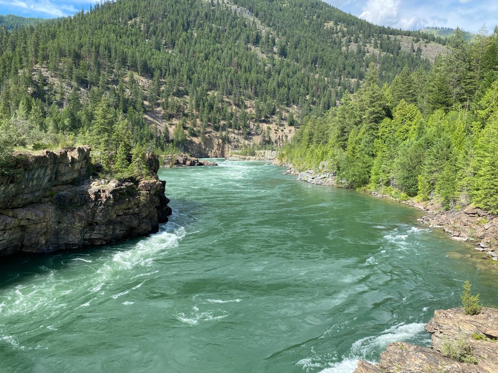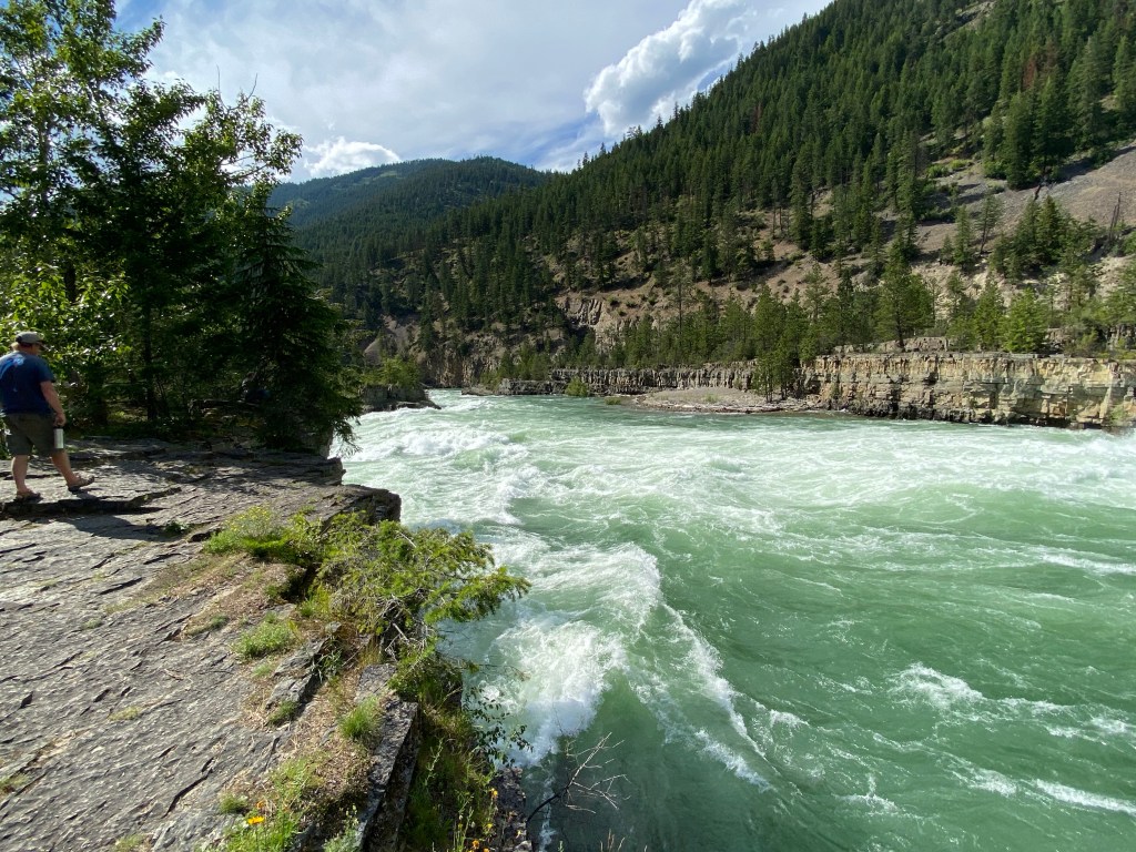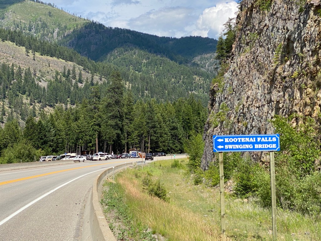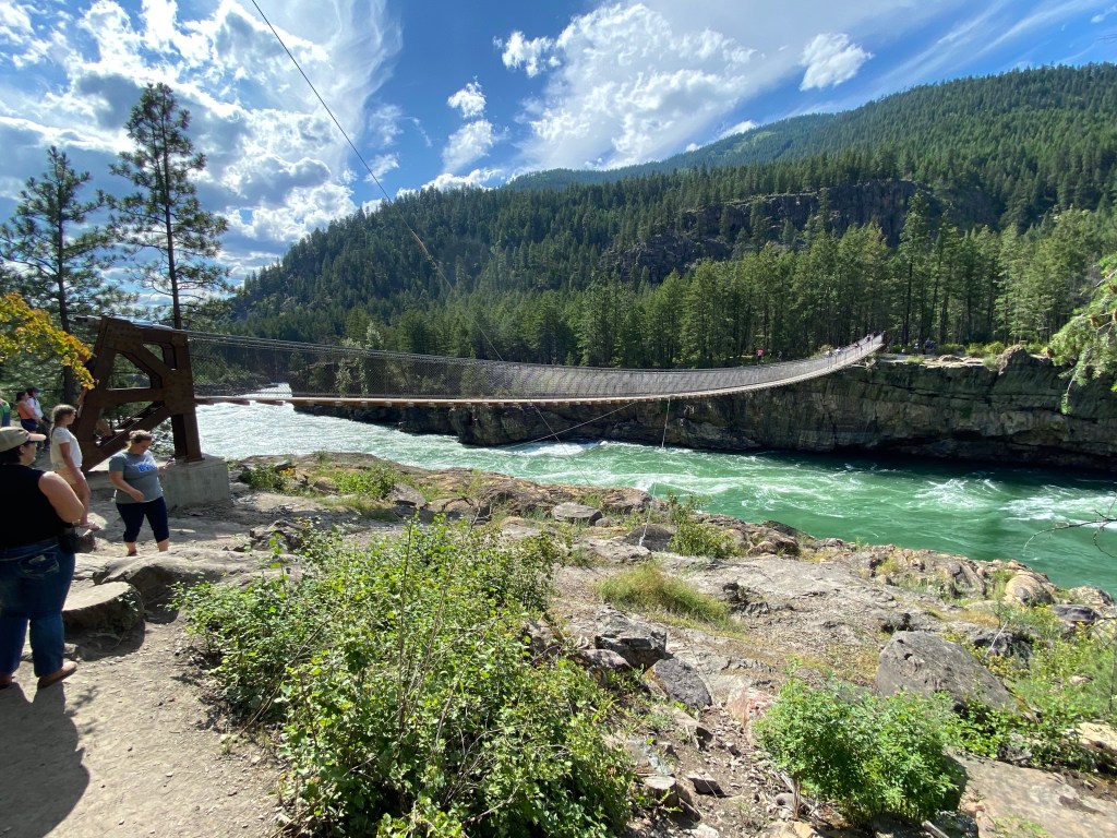 Lunch is near the 62-mile mark in a cutout next to the Bull River. Gorgeous scenery and lunch is the best yet – chicken and apple wraps, banana, and watermelon. And a surprise birthday cake! Left the iPhone charging in the support van for the next stretch. After a rather lengthy pause, the ride resumed with the next stopping point, Kootenai Falls and ice cream at mile 87. The rollers continue and get a little longer but grade rarely exceeds 3%. Executed a u-turn upon reaching the Falls to add a few miles to ensure the ride is at least a century. Have 2 scoops of birthday cake ice cream and walk to both the Falls and the swinging bridge for photos. iPhone was sufficiently charged to take pictures. Only 11 miles remain until Libby, MT. Rollers continue and able to increase overall average speed to 19.7 mph at just under 2.5 w/kg.