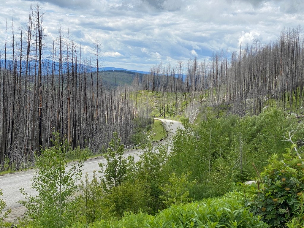 Mile 80 started the pyramid, aptly named for its ridewithgps profile resemblance to the geometric shape. It’s a 9-mile climb through the Okanogan National Forest that transitions to the Colville National Forest near the summit. Initially there was a meager power target for the climb but that was rudely jettisoned about 4 miles into the climb. The first mile and a half or is deceiving and fosters thoughts of an overly optimistic climbing time. However, the grade quickly increases from 3% to an average of 5.2% for the next 6+ miles. To add insult to injury, there’s a mile near the summit that averages nearly 7%. The power target was replaced with, just crest the climb. The devastating effect of wildfires is far more evident in this section of the Okanogan. Charred remains stand sentinel in vast hillsides of lush green undergrowth. The recovery process continues but it will take time.