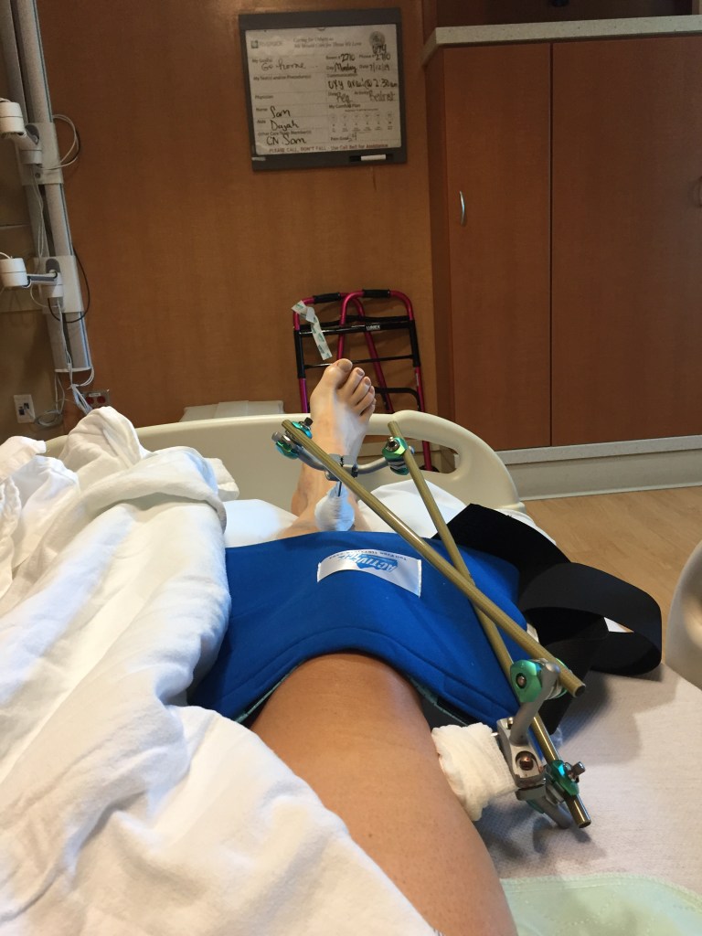 The initial shock soon wore off and discomfort levels increased until an IV was inserted and goodness started flowing. To be honest, don’t recall all of the activities upon reaching the hospital, relocating to gurneys, x-rays, and other triage actions. While the forearm wound was being stitched close, learned my leg was broken. Didn’t pay too much attention until one of the nurses indicated I was being admitted for an overnight stay. Turns out it was not just any break but a tibial plateau fracture (TPF). There would be no cast. Scheduled for surgery the following morning to have an external fixator (Ex-Fix) applied/installed/attached. At some point The Missus, girl child and fiancée made it to the hospital. The Missus was a wreck and devastated to see me lying in bed with my forearm and leg all wrapped up.