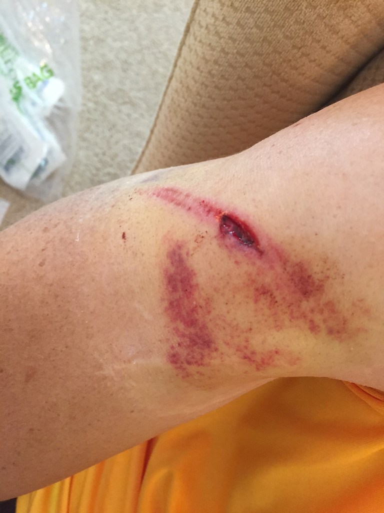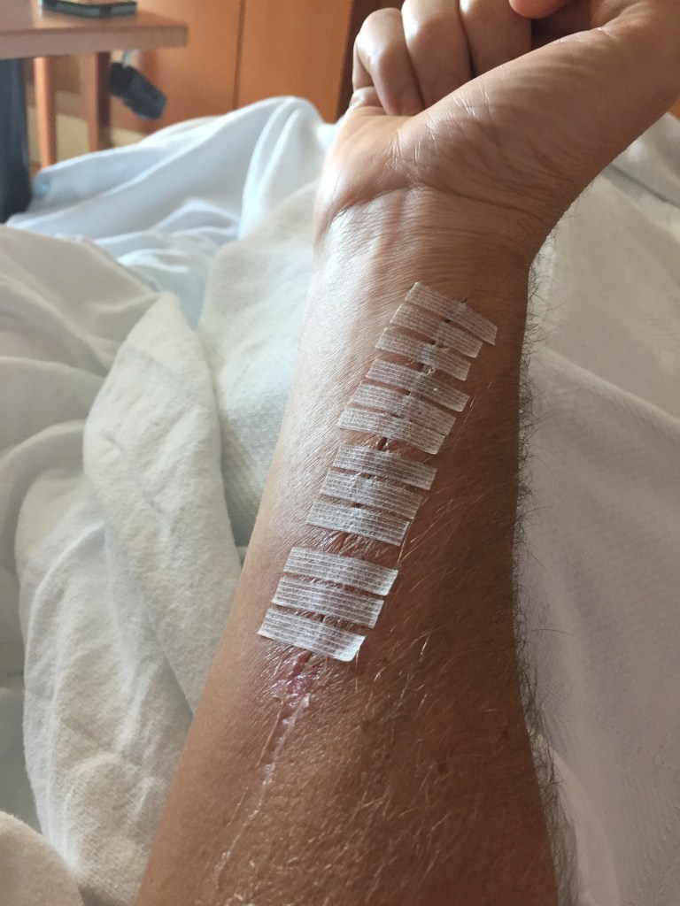 Sure enough, descent started around 4.5- mile mark and picked up quite a bit of speed. Too much speed. Near the bottom of the descent was a sweeping curve to the left. TT rim brakes aren’t known for their stopping power and unable to successfully navigate the turn. Rode the guardrail for a bit then, crash! Next I knew I was laying on my back, in the wood line, on the other side of the guardrail. A cursory inventory of the damage revealed a clean, nearly 5-inch long laceration on the inside of my right forearm. The flap of skin was laid back, exposing all the things one isn’t supposed to see – tendons, ligaments, radial artery. Also had a puncture wound in upper arm apparently caused by impaling myself on 1-inch diameter stick. Never lost consciousness and thankfully didn’t have to wait too long before a course official discovered me and called 911. Mildly uncomfortable getting strapped to the backboard when the EMS team arrived. Experienced a new pain in the right leg when feet were positioned to allow straps to be tightened. Annoyingly, had to keep repeating my name and the Missus’ contact number while the EMS made several attempts to contact her and let her know where they were taking me. The Missus was out for her run and she had a few, nonspecific voice mails waiting for her upon her return to the house. Meanwhile, I’m off to the largest full-service hospital in the area.