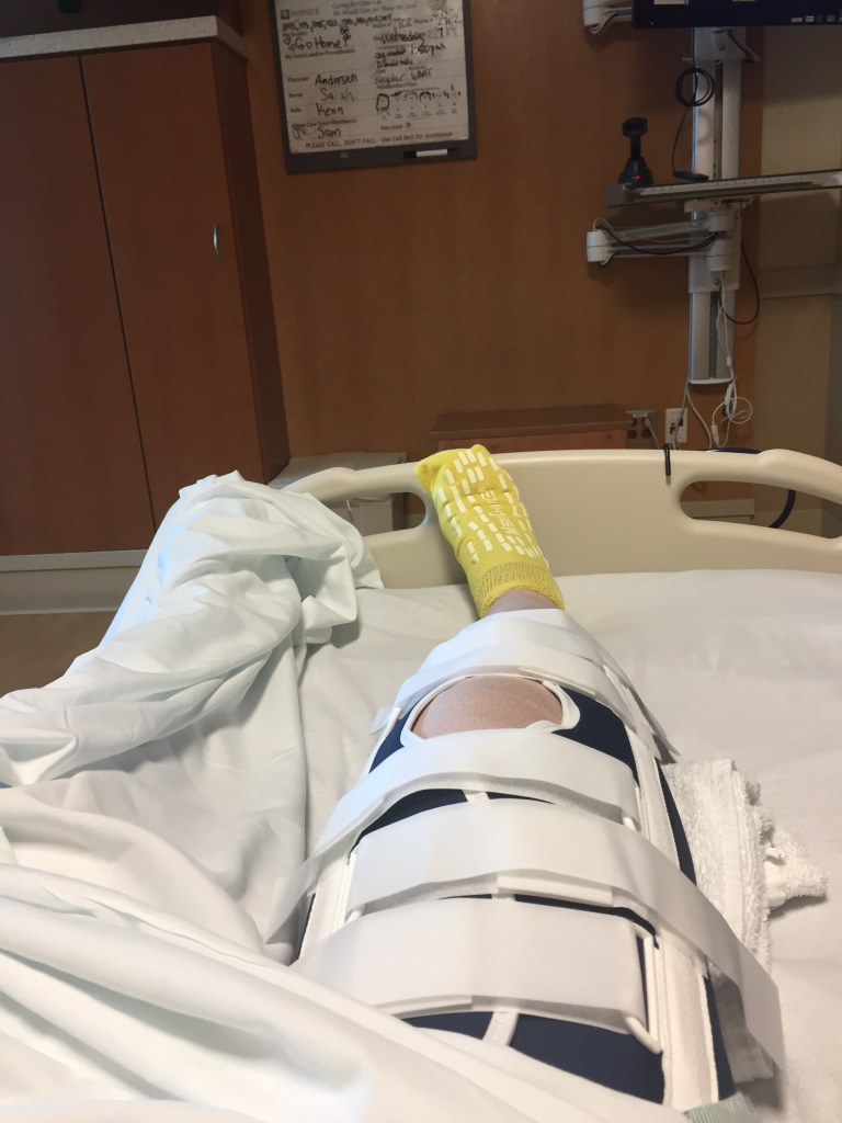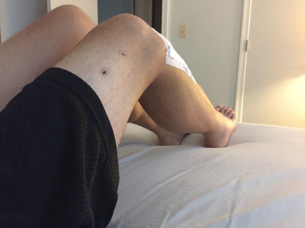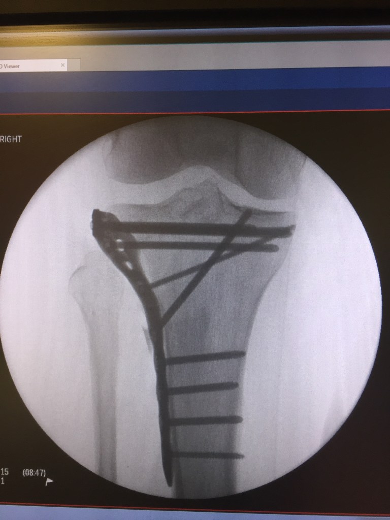 A TPF is a break or fracture in the top of the shin bone and are graded on a 1-6 score. Ever the high achiever, mine was a grade 6 but non-displaced. Additionally, there was no damage to tendons, ligaments, muscles, meniscus, or skin. The only visible sign was a small mark just below the knee – the impact site of the guardrail. While there wasn’t any collateral damage, there was still significant trauma to the area. The Ex-Fix is used to allow the body to begin recovering from the trauma, naturally clear out the impact site, and most importantly, reduce the risk of infection following the actual procedure to fix the break. My Ex-Fix consisted of 2 bolts attached to the outside of my femur and 2 bolts attached to the inside of the tibia. Two titanium rods connected the bolts keeping the bones properly aligned. The 4 bolts protruded about 2.5 inches through the skin. A little gruesome thinking about, slightly nauseating looking at it, and rather painful feeling it. Extremely fortunate to have an excellent orthopedic surgeon on staff. The Missus would be driving me 2+ hours one way for every follow-up visit. Pain was intense but nothing a combination of dilaudid and oxy couldn’t handle although only had the former for the first 24 hours. Bad nights’ sleep were just beginning. Discharged from the hospital after a two day stay. Mobility was a learning process and would make friends with a walker. Sat in the back seat, sideways, for the drive home. That was not a comfortable trip. The Ex-Fix would be part of me for the next 16 days and only the beginning of the non-weight bearing time. As the head of the bone isn’t as hard as the shaft, any load placed on a TPF risks worsening the fracture or causing a displacement of a bone fragment. Then things really get ugly.