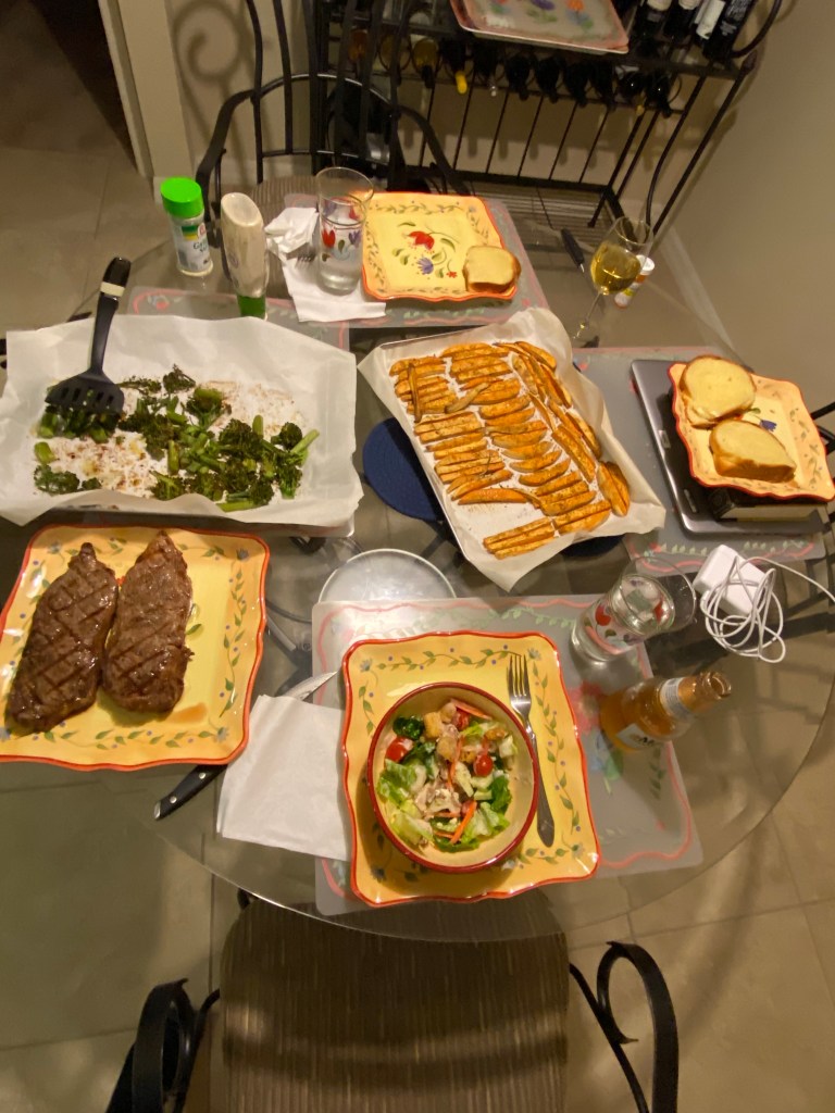 Jewish Apple CakeMongolian Beef with lo minchicken scallopinichicken scarpiello, potato gratin with Gruyere, roasted brussel sprouts, and fresh breadAnts on a TreeThe Missus’ cherry piecheese ravioli