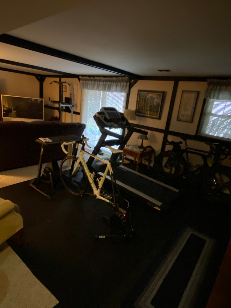 Spent time at our southern retreat in Nov and Dec, with the Missus and without. Really becoming less and less tolerable of the cold and would greatly prefer to winter down south. Used to prefer cycling outdoors in almost any temperature as long as the roads were clear over spending time in the garage making puddles on the floor during a Zwift or TrainerRoad workout. Not so much anymore; done with having frozen water bottles – not to mention feet and fingers. Latest change to the indoor setup was moving inside down to the basement. The Missus is now able to park her car in the garage for the first time since we bought the house back in 1997. She’s very happy that her windshield scraping days have ended. The basement isn’t too bad – more temperate than the garage which has its pluses and minuses. Purchased 2 4’ x 10’ 3/8” pre-cut heavy duty rubber rolls (each weighs 88 pounds) and a Kickr Headwind fan. Shipping charges on the rolls were half the price of two rolls – hefty indeed! The Headwind is overpriced (same as the stand/table) but does an excellent job, on 100%, of preventing puddles. We’ll see how it performs on rides longer than 2 hours. May have to procure another and set it behind the trainer for a simultaneous head and tail wind.