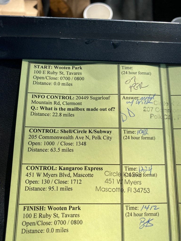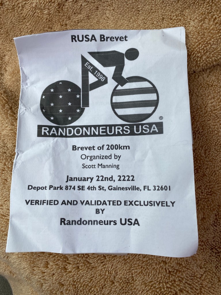 First official randonneuring event was the Tavares – Polk City 200K Brevet. Start point was Wooten Park about a 60-minute drive from our FL retreat. Roll time was 0700 so it was a moderately early morning but not dreadful. Stayed overnight in Tavares as the 300K the following day had an 0600 start. Who knew but Tavares is America’s Seaplane City, at least that’s what the signs proclaim. As proof, there were several seaplanes, on the water and parking lot, at the park. Sunrise on the lake was very peaceful. Sign-in, introductions, etc. was all before sunrise. Quickly discovered that there was one other newbie – the remaining 20+ riders had various years of randonneuring experience, many of them successfully completed the holy grail of randonneuring, Paris-Brest-Paris (PBP), and most knew one another. The cyclists came in all shapes and sizes (but not colors) with bikes to match: road, flat bar, recumbents. So, randonneuring events are not races, but are timed, without SAG support or organized rest stops. Instead, there are control points which may be informational (e.g., posted business hours of the establishment at the address serving as a control point) or a place of business that will stamp and/or initial your brevet card. The intent is to provide verification that you successfully rode to each of the control points (or at least visited each control point) and annotated the brevet card appropriately (i.e., arrival time at each control point, answer to an informational control point, and stamp or initial at a standard control point). Self-supporting is the primary theme – carry what you need or plan for refueling stops along the way. Fortunately, many of the control points are at gas stations or other business that offer food and drink. Ensure your bike is in sound condition as there won’t be an on-site mechanic. Cue sheet format also varies – some leaders only make paper cue sheets available so know how to create your own gps file while other leaders offer both digital and paper variants.