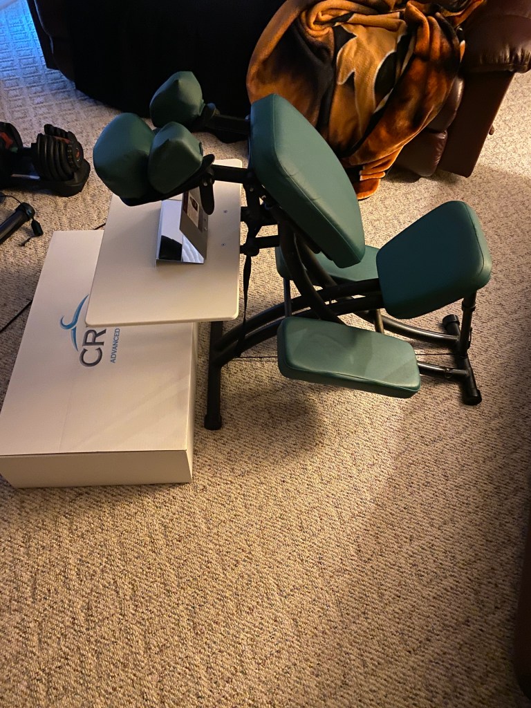 Corrective procedures include pneumatic retinopexy: gas bubble to replace vitreous; vitrectomy: removal of vitreous and replaced with air, gas, or oil bubble. Eye will produce vitreous over time and the air or gas bubble will be absorbed. Oil must be removed later; and scleral buckle: a band of rubber, plastic, or silicone sewn around eye to change shape of eye – pressing it against the eye wall. Lucky me, had all three (N20). The air or gas bubble requires maintaining a face down position for as much of the day/night as possible for a week or more to help ensure the optimal position for the retina to reattach. Air or gas bubble also precludes air travel as changes in atmospheric pressure could cause the eye to burst. Doc was considerate and only required 7 days. Comfort Solutions provides devices – similar to a masseuse chair and ancillary pieces for the end of the bed or sitting at a table that facilitate the position without placing a strain on the back of the neck muscles. Not very comfortable and certainly not enjoyable way to spend a week. A bonus accessory is a hinged mirror that allows for TV viewing in a face down position.