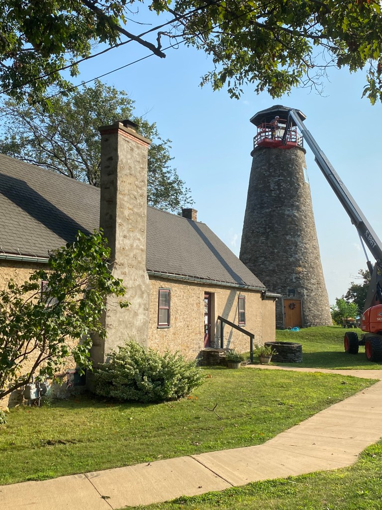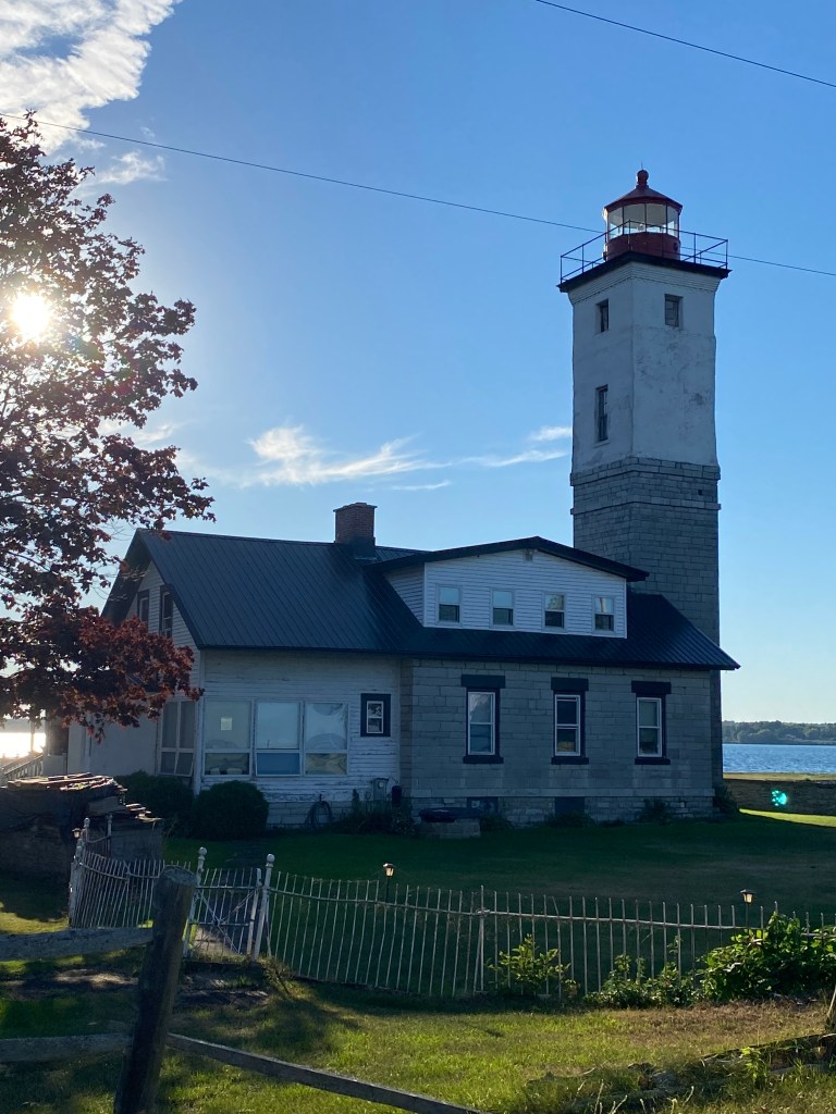 First stop Tibbett’s Point Light in Vincent Bay which is the only US city to enjoy both Lake Ontario and St Lawrence River. The Light was built in 1827 and features the only original working Fresnel lens on Lake Ontario. The tower was replaced in 1854 with current circular one. USCG ceased duties in 1981 and the quarters became a Youth Hostel in 1984. Two other Lights out on Lake Ontario, East Charity Shoal and Pigeon Island Lights, are visible from the back deck of the Fog Signal building. Pigeon Island Light, a Canadian Light, looks like a pencil out on the Lake as the island isn’t visible.