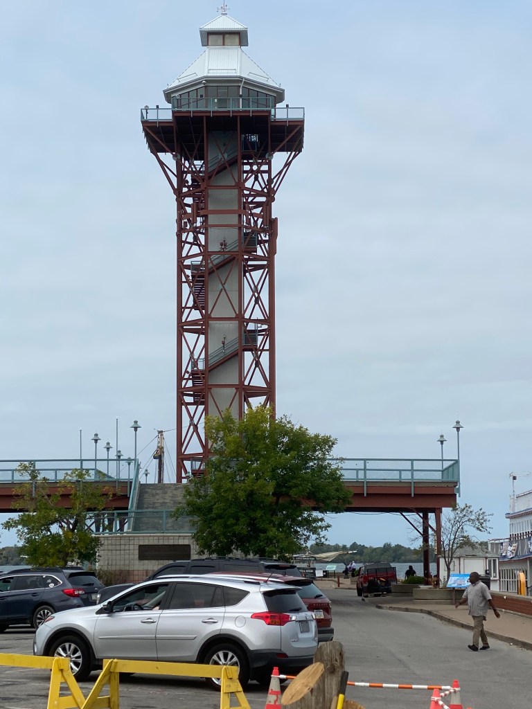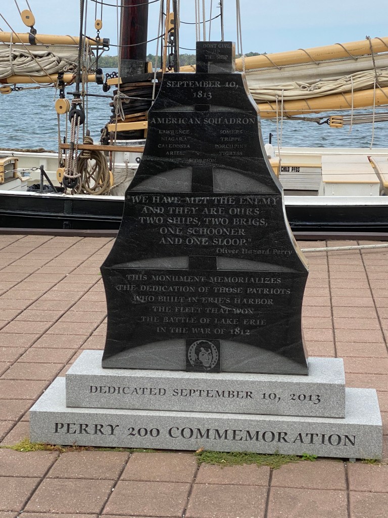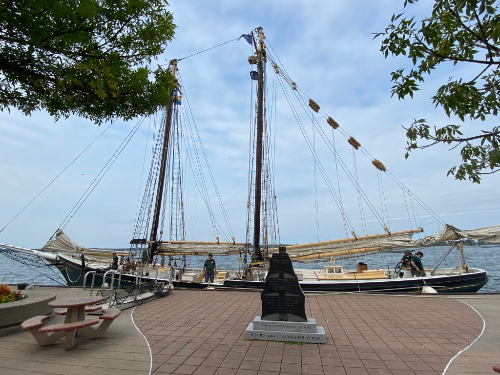 A pretty good first day on the Seaway Trail; not overly long and broken up by a couple of lighthouse stops. The Trail is fairly well-marked with road signage and the pavement is in decent shaped. A few sections even had relatively new pavement. Nothing remarkable from Conneaut to Presque Isle which doesn’t have an entrance fee. Surprisingly, all of the island beaches were closed. Don’t know if the season ends on Labor Day weekend or not. As a result, traffic was minimal although there were a couple of ladies on scooters who didn’t think the 25 mph speed limit applied to them. I silently chuckled when one of them dropped a personal item from their scooter and gave a shrill shriek when a following car ran over the item. The first sign indicated the Presque Isle Lighthouse was open but the gate to the actual compound and welcome center was closed and barred with a sign suggesting visitors shop online. The few glimpses of lake water on the northwest side of the Isle were a crisp blue; certainly not the murky color I was accustomed to seeing. I caught up with the SAG crew on the way to the North Pier Light which was hidden behind two huge piles of sand. After a few photos and fresh water bottle, it was off to Erie proper. Didn’t quite follow the RidewithGPS route and ended up on State Street, Dobbins Landing, to see the Bicentennial Tower which was built in 1996 to commemorate Erie’s bicentennial year 1996. The Landing also had a two-masted schooner and paddlewheel boat moored at the dock.