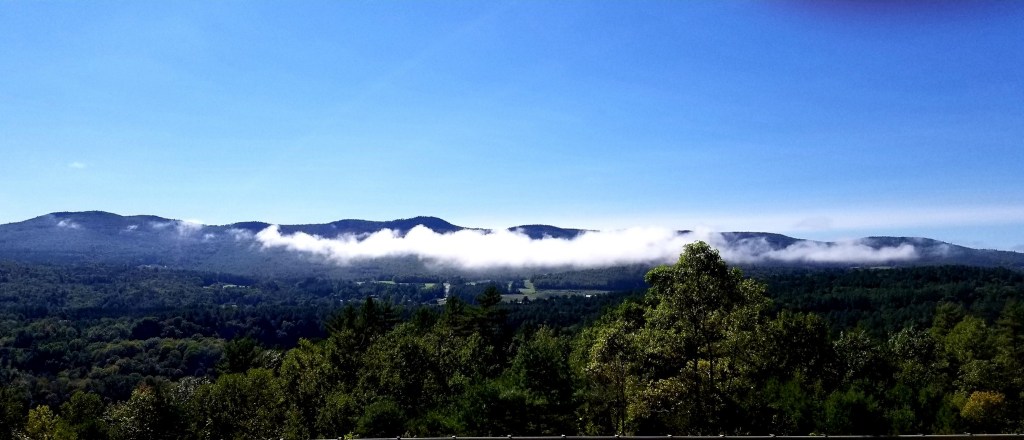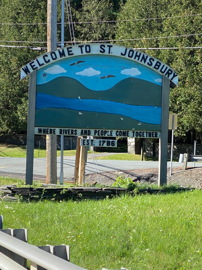 Return home day – after one final ride and a new state to add to the list. Sis discovered our intended breakfast stop didn’t open until 0830 – thirty minutes later than the restaurant sheet from the front desk indicated. There was another ‘supposed’ breakfast place that opened at 0800 but when we arrived, doors were closed, and lights were off. The adjoining café offered pre-made breakfast sandwiches. Pass. Thank you. The breakfast option at the Tapestry was ala cart (pay for each item) but there wasn’t an attendant in sight. So we finished loading up and drove to The Wayside Restaurant which was only a couple of miles away and mostly on the way. Today’s selection was the Canadian Combo – 2 eggs over easy, 2 pancakes, links, ham. It was foggy in stretches on the drive to the drop off point with temperatures fluctuating by 10°. Shocked as we drove through Saint Johnsbury as expected it be a small village. Quite the contrary. The downtown seemed bigger and more diverse than the capital. Knew Montpelier was small but turns out its population is only greater than St Johnsbury by about 150 people, 7,248 vs 7,110. Should have conducted more research and stayed much closer to the starting point. Lesson learned for next time.